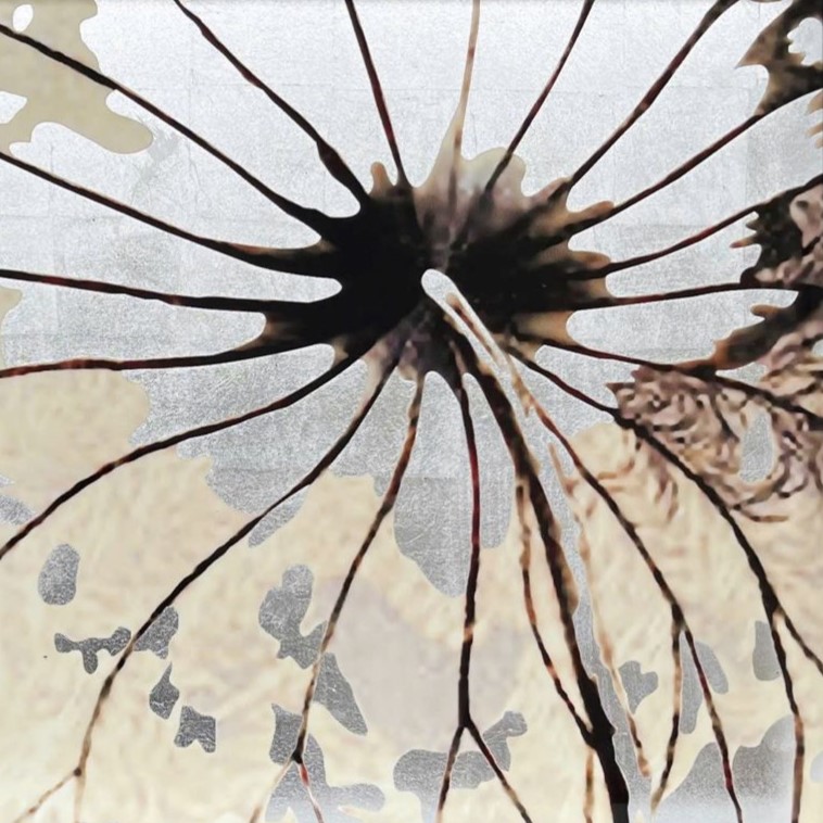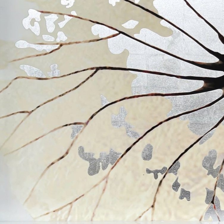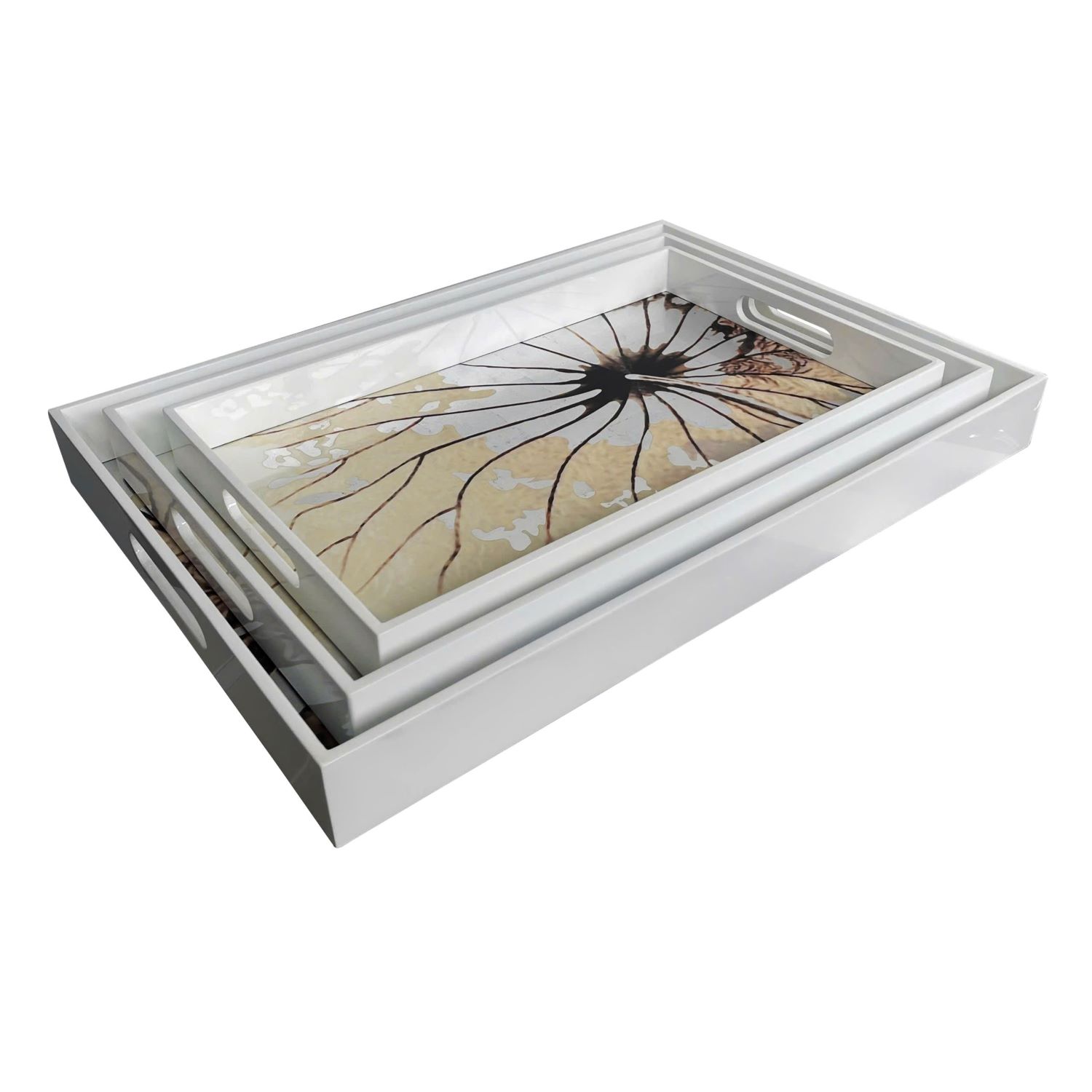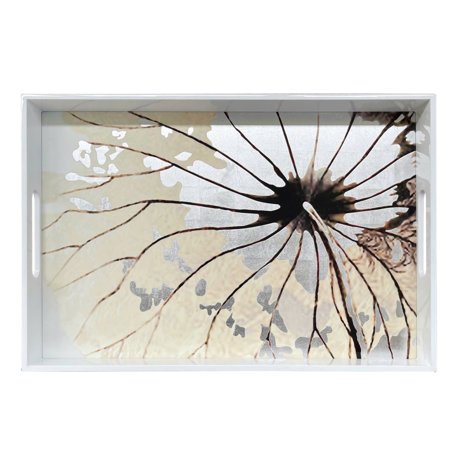 BANDEJA RECTANGULAR DE MADERA LAQUEADA BLACA Y PLATEADA CON FLOR DE LOTO