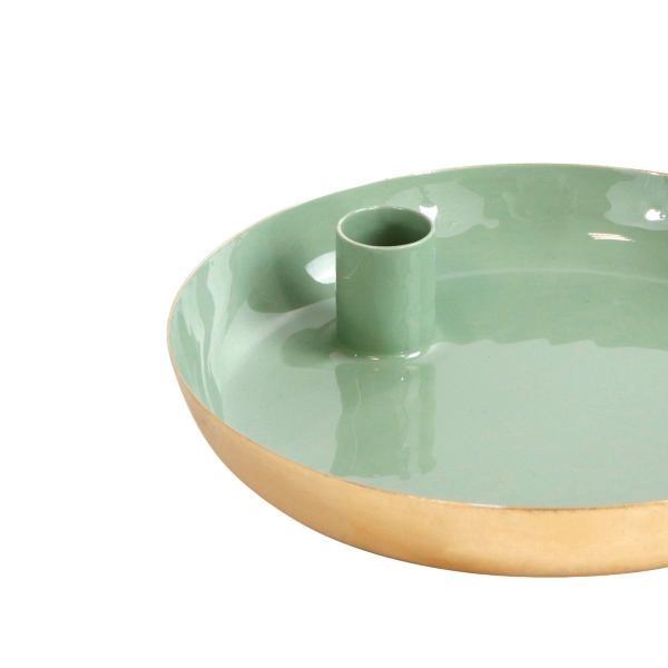 CANDELABRO MODELO DELUXE. ESTÁ PROVISTOS DE UNA CAPA DE ORO BRILLANTE EN LA PARTE INFERIOR. FABRICADOS EN HIERRO CON UN ACABADO ESMALTADO BRILLANTE VERDE. PARA 1 VELA