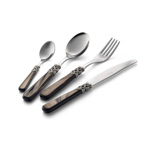 EL MODELO GINEVRA ES UNA SERIE DE CUBIERTOS QUE VIENE DE UNA INSPIRACIÓN CLÁSICA. LOS BONITOS MANGOS DE AGARRE HECHOS CON LOS COLORES DE NÁCAR TIENEN EXTREMOS REDONDEADOS. LAS FORMAS TAMBIÉN SE DESTACAN POR EL ANILLO PERFORADO CON UN ACABADO PLATEADO ANTIGUO FINAMENTE ENTRETEJIDO QUE SE UNE A LA PARTE SUPERIOR DE ACERO 18/10 PULIDO A ESPEJO.