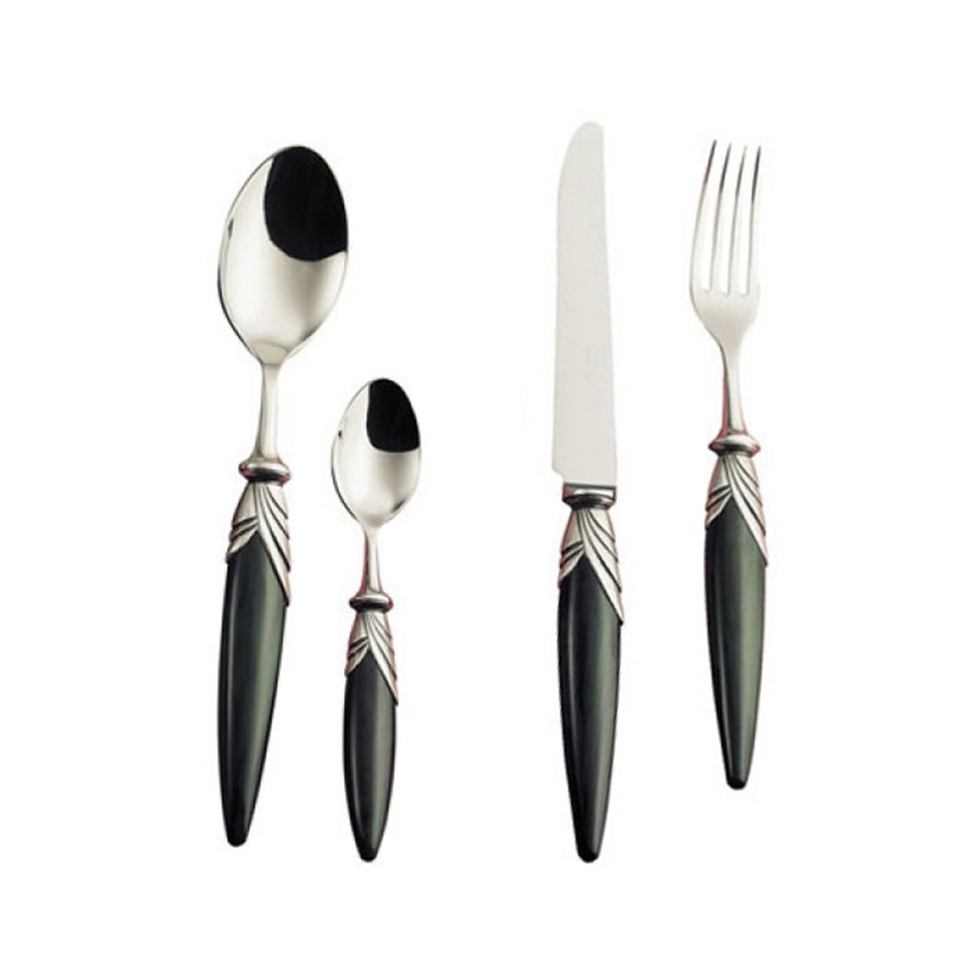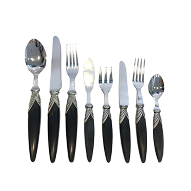 JUEGO DE CUBIERTOS MODELO URBI DE 104 PIEZAS. HERRAJES DE ACERO INOXIDABLE VIROLA PLATEADA Y MANGO DE RESINA.