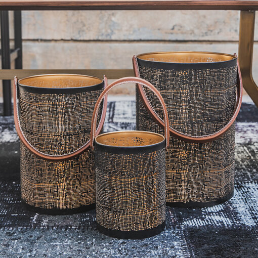 FANAL NEGRO Y DORADO DE METAL CON ASAS DE CUERO