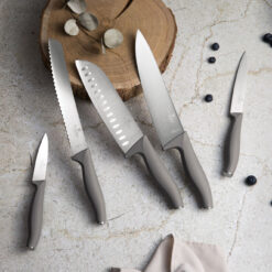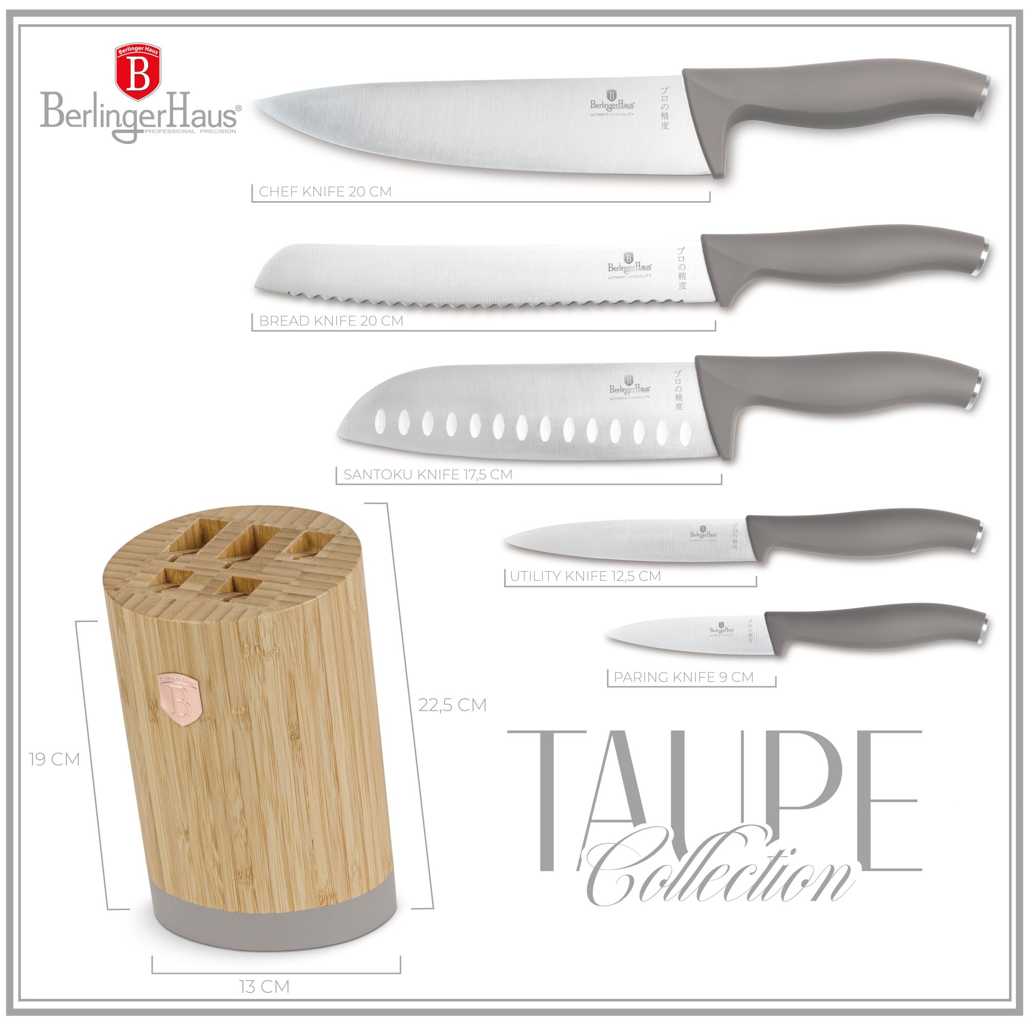 JUEGO DE 6 CUCHILLOS COLECCION TAUPE. 1 CUCHILLO DE CHEF DE 20 CM: POTENTE Y VERSÁTIL PERFECTO PARA CORTAR PICAR Y TROCEAR. 1 CUCHILLO DE PAN 20 CM: FILO DENTADO IDEAL PARA CORTAR PAN CRUJIENTE SIN APLASTAR EL INTERIOR BLANDO. 1 CUCHILLO SANTOKU 17 5 CM: FILO GRANTON PERFECTO PARA REBANAR CORTAR EN CUBITOS Y PICAR VERDURAS Y CARNES. 1 CUCHILLO MULTIUSOS 12 5 CM: PARA CORTAR FRUTAS VERDURAS Y PEQUEÑOS CORTES DE CARNE. 1 CUCHILLO PELADOR DE 9 CM: IDEAL PARA TAREAS COMPLEJAS COMO PELAR RECORTAR Y DECORAR. MANGO ERGONÓMICO SUAVE AL TACTO. SOPORTE DE BAMBÚ.
