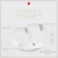 JUEGO DE 18 PIEZAS COLECCIÓN SAHARA. FABRICADA EN PORCELANA DE PRIMERA CALIDAD ESTA VAJILLA COMBINA DURABILIDAD CON UN ELEGANTE DISEÑO EN BLANCO Y CREMA. ES APTA PARA LAVAVAJILLAS Y MICROONDAS LO QUE LA HACE TAN PRÁCTICA COMO ELEGANTE. PLATOS LLANOS (6 PIEZAS): 24 7 X 25 CM – PERFECTOS PARA PLATOS PRINCIPALES Y PORCIONES MÁS GRANDES. PLATOS HONDOS (6 PIEZAS): 21 7 X 21 8 CM – IDEALES PARA SOPAS GUISOS Y PLATOS DE PASTA. PLATOS DE POSTRE (6 PIEZAS): 19 5 X 19 8 CM – IDEALES PARA POSTRES SNACKS O APERITIVOS.