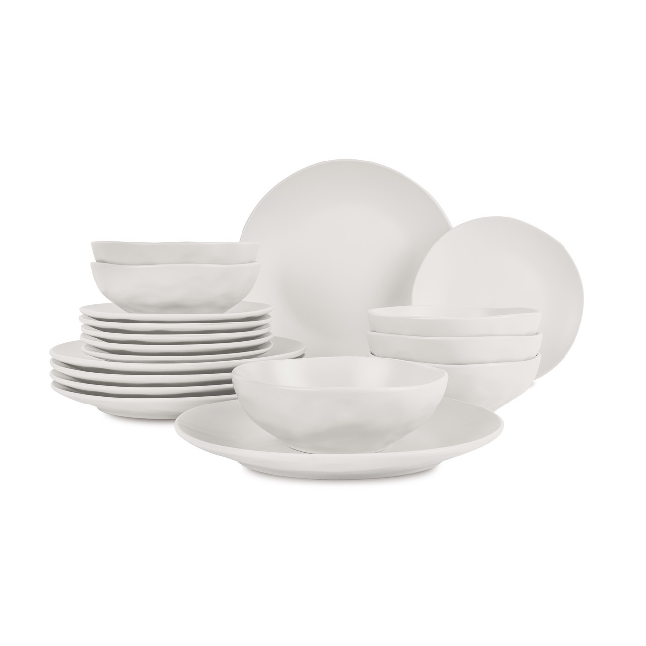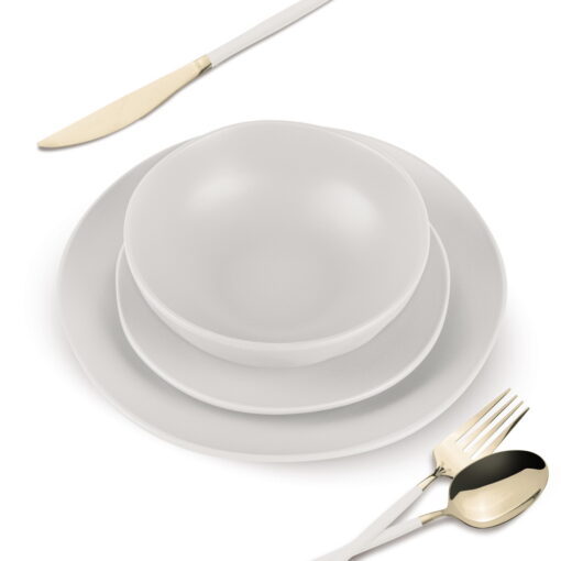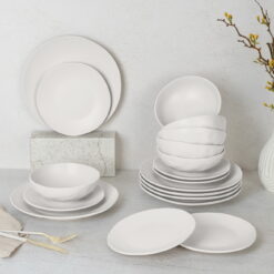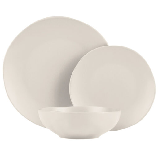 JUEGO DE PLATOS DE CERAMICA COLOR CREMA. 18 PIEZAS: 6 PLATOS LLANOS 6 PLATOS POSTRE Y 6 BOLS. APTO PARA LAVAVAJILLAS. APTO PARA MICROONDAS.