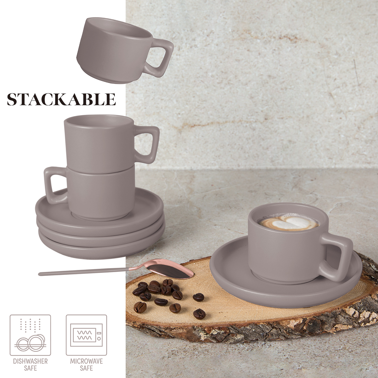 JUEGO DE 4 TAZAS DE CAFÉ CON PLATO COLECCIÓN TAUPE. FABRICADO EN GRES DE PRIMERA CALIDAD ESTE JUEGO INCLUYE 4 TAZAS DE ESPRESSO Y 4 PLATOS A JUEGO TODOS CON UN SUAVE ACABADO EN COLOR GRIS AMARRONADO. LAS TAZAS DE 5 X 6 5 CM Y 100 ML DE CAPACIDAD SON PERFECTAS PARA SUS ESPRESSOS DIARIOS MIENTRAS QUE LOS PLATOS DE 12 8 X 1 5 CM SON IDEALES PARA ACOMPAÑAR GALLETAS O PEQUEÑOS CAPRICHOS. APTO PARA LAVAVAJILLAS Y MICROONDAS ESTE JUEGO OFRECE PRACTICIDAD Y UN ATRACTIVO ESTÉTICO SIMPLIFICANDO LA PREPARACIÓN DE BEBIDAS Y LA LIMPIEZA.