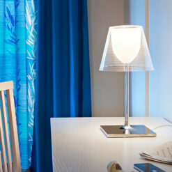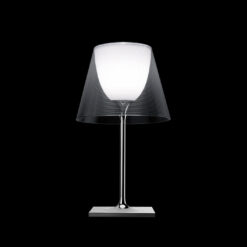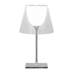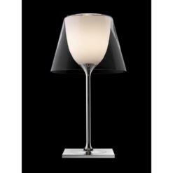 LAMPARA DE MESA MODELO TRIBI. DE ILUMINACIÓN DIFUSA. BASE SOPORTE VARILLA Y SOPORTE DIFUSOR EN ALEACIÓN DE FUNDIDA A PRESIÓN PULIDA Y CROMADA. DIFUSOR INTERIOR OPALINO MOLDEADO POR INYECCIÓN DE POLICARBONATO. DIFUSORES EXTERIORES DE POLIMETILMETACRILATO TRANSPARENTE EN LA SUPERFICIE INTERIOR MEDIANTE REVESTIMIENTO DE ALUMINIO AL VACÍO. ARO SUPERIOR DE VIDRIO ESPEJADO. .BOMBILLA E27 1*40W.