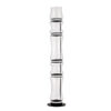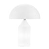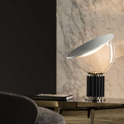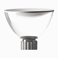 LAMPARA DE MESA MODELO TACHA. CON PANTALLA EN VIDRIO Y BASE EN ALUMINIO PARA BOMBITA DE 60 W. SE COMPONE DE UNA BASE CIRCULAR RODEADA DE COLUMNAS GRIEGAS Y UN DIFUSOR FORMADO POR UN GRAN CUENCO DE CRISTAL TRANSPARENTE CERRADO POR UNA PLACA OPACA QUE REFLEJA LA LUZ. PROPORCIONA LUZ INDIRECTA Y REFLEJADA. REFLECTOR DE ALUMINIO PINTADO BLANCO/BRILLANTE POR FUERA Y BLANCO/MATE POR DENTRO. DIFUSOR DIRECCIONAL DE VIDRIO SOPLADO TRANSPARENTE. CUERPO NEGRO MATE BASE DE METAL NIQUELADO. DISEÑO VINTAGE