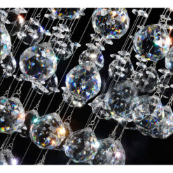 LAMPARA DE TECHO MODELO PLANET. CADA CRISTAL PENDE DE UNA LINGA A DIFERENTE ALTURA Y FORMA UNA ESFERA QUE QUEDA SUSPENDIDA EN EL AIRE FORMANDO UN PLANETA. SE ILUMINA CON VARIAS LUCES DICROICAS QUE HACEN UN EFECTO BRILLANTE AL TOMAR CONTACTO CON LOS CRISTALES.