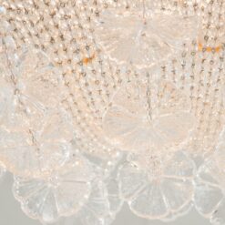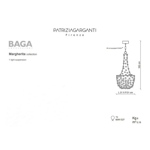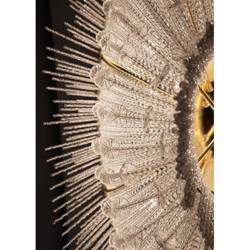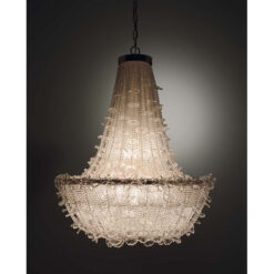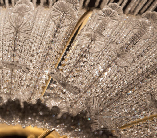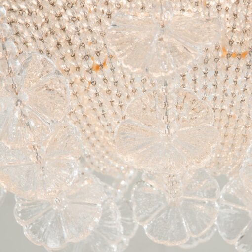 LAMPARA DE TECHO MODELO MARGUERITA. DISEÑADA POR PATRIZIA GARGANTI. UN RAMO DE FLORES. UNA ESTRUCTURA METÁLICA TRADICIONAL ALBERGA UNA CADENA DE PERLAS TRANSPARENTES ENRIQUECIDAS CON MARGARITAS EN VIDRIO SOPLADO DE MURANO: HECHAS A MANO MANTIENEN LA NATURALIDAD QUE LES DA SU SINGULARIDAD AL IGUAL QUE LAS FLORES. BOMBILLA E27 1X42 WATT