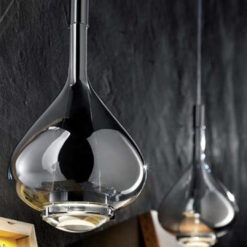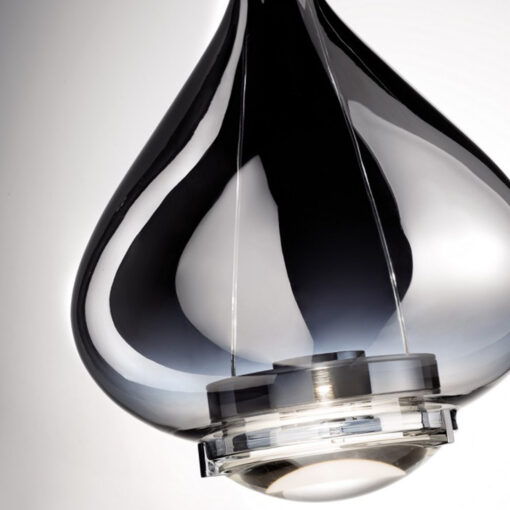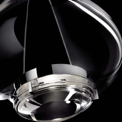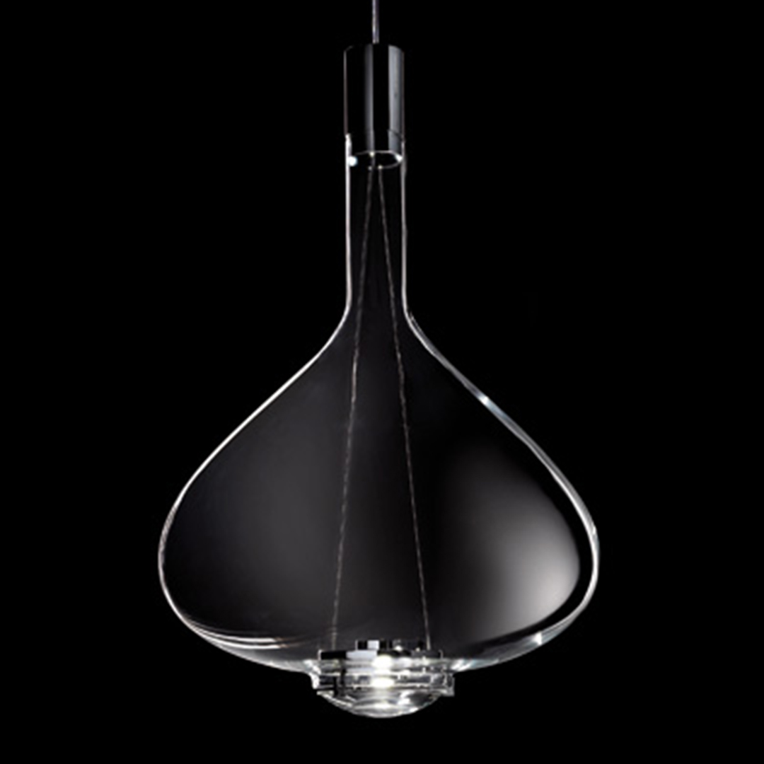 LAMPARA DE TECHO MODELO SKY FALL. CON ESTRUCTURA METÁLICA Y DIFUSOR DE VIDRIO SOPLADO. EL DIFUSOR CONVEXO SE ESTRECHA HACIA ARRIBA Y RECUERDA A UNA BOTELLA HINCHADA REMINISCENCIA DE DECANTADORES ANTIGUOS PERO SORPRENDE PORQUE APARENTEMENTE NO CONTIENE BOMBILLA. DOS FUENTES DE LUZ LED PROPORCIONAN LUZ Y DE MANERA DIFUSA PERO TAMBIÉN DIRECTA HACIA ABAJO. DOS FILAMENTOS VERTICALES SON VISIBLES A TRAVÉS DEL VIDRIO TRANSPARENTE DENTRO DEL DIFUSOR. SU FUNCIÓN SORPRENDE GRACIAS A LA INNOVADORA FUENTE DOBLE LED DE 10 W QUE DIFUNDE LA LUZ DIRECTA E INDIRECTA.