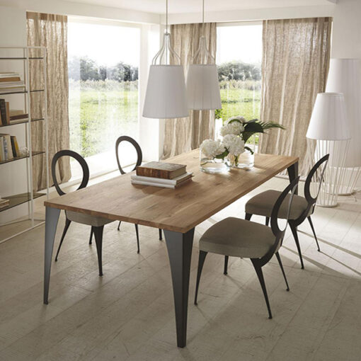 MESA DE COMEDOR MODELO MALAGA. LA TAPA RECTANGULAR ESTÁ FABRICADA CON MADERA MACIZA DE ROBLE EN COLOR NATURAL. LAS CUATRO PATAS DE HIERRO MACIZO CORTADAS CON LÁSER ACABADAS Y ALISADAS A MANO CON DIFERENTES EFECTOS ESTÉTICOS PARA ADAPTAR MEJOR LA MESA. MÁLAGA DE CANTORI PARA TODOS LOS ESTILOS DE VIDA. MODERNA Y SOBRIA O CLÁSICA Y DECORATIVA