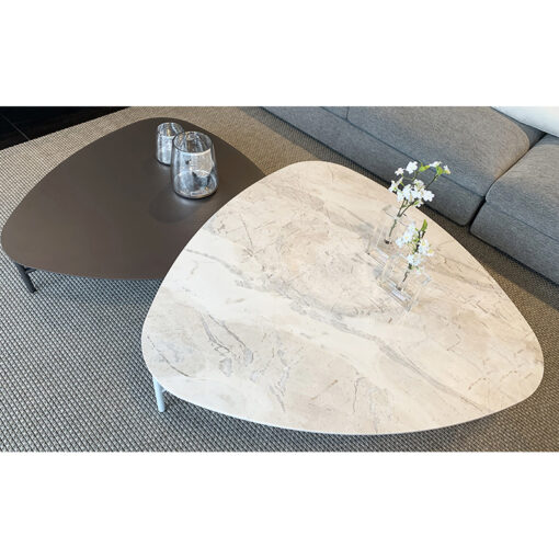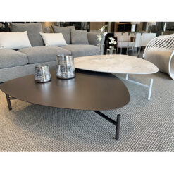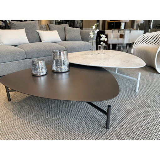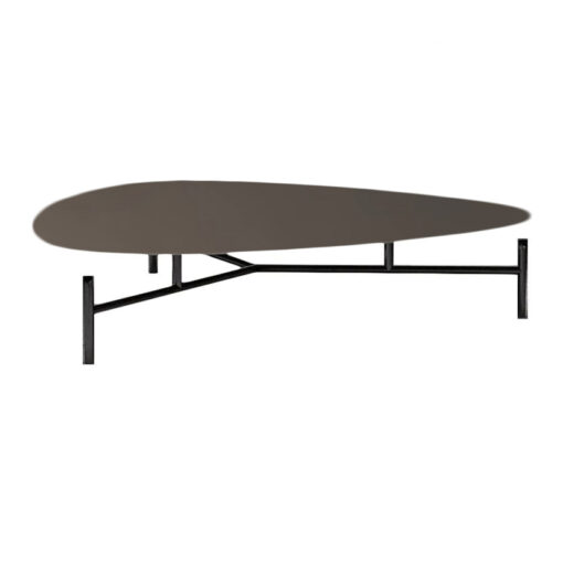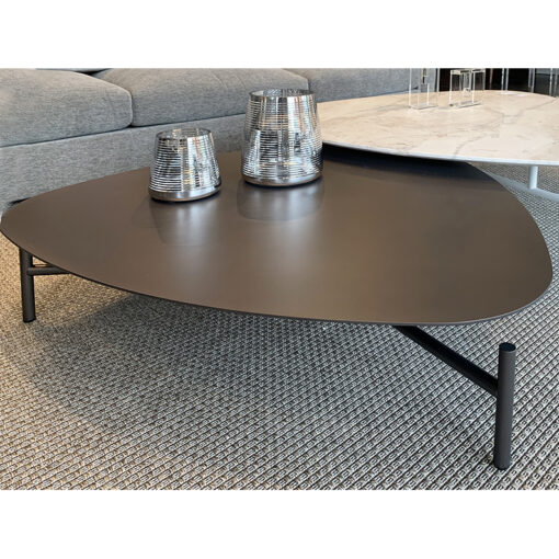 MESA DE LIVING MODELO FINSBURRY. TAPA DE MADERA LAQUEADA EN COLOR GRAFITO Y BASE DE GRAFITO. CON SU FORMA TRIANGULAR Y AFILADA SIMILAR A UNA PÚA DE GUITARRA LA SUPERFICIE ULTRAFINA DE LA MESA DE CENTRO FINSBURY ESTÁ CÁLIDAMENTE TERMINADA PARA BRINDAR UNA SENSACIÓN ACOGEDORA. UNA BASE DE TUBERÍA DE METAL RECUBIERTA DE LATÓN CON TRES PATAS SEPARADAS PROPORCIONA UNA BASE SÓLIDA PARA LA SUPERFICIE.