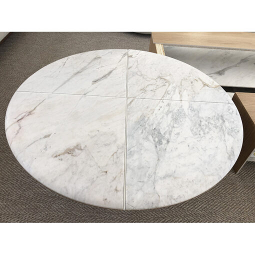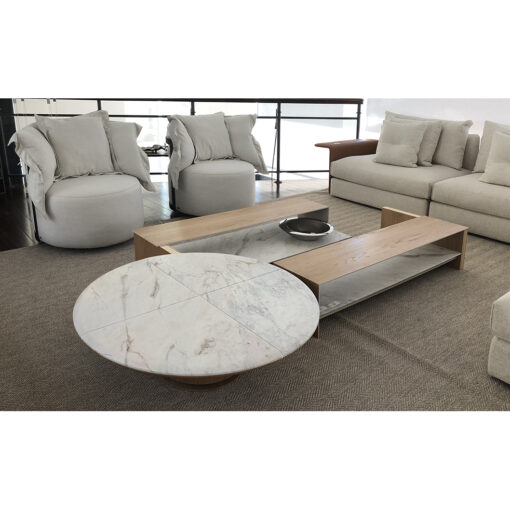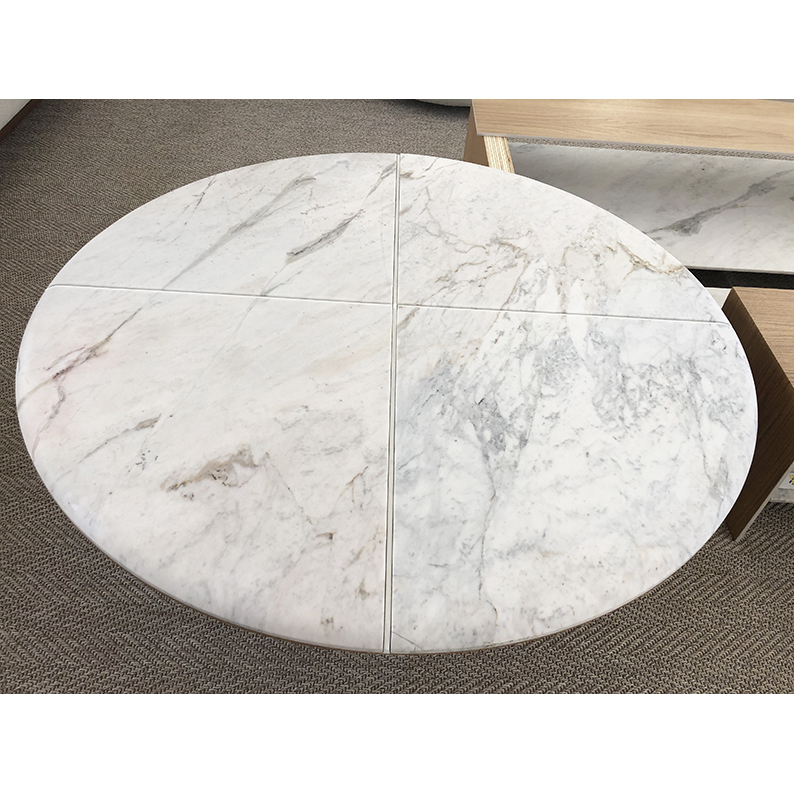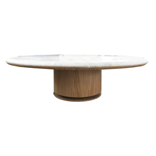 MESA DE LIVING MODELO CISA. TODA EN MADERA COLOR ROBLE NATURAL Y TAPA EN MARMOL BLANCO