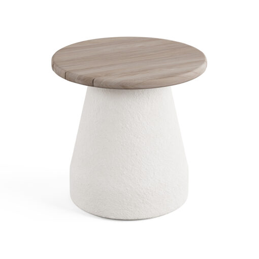 MESA REDONDA LATERAL PARA EXTERIOR MODELO KANO TAPA EN MADERA DE TEKA Y BASE EN CEMENTO TEXTURADO BLANCO