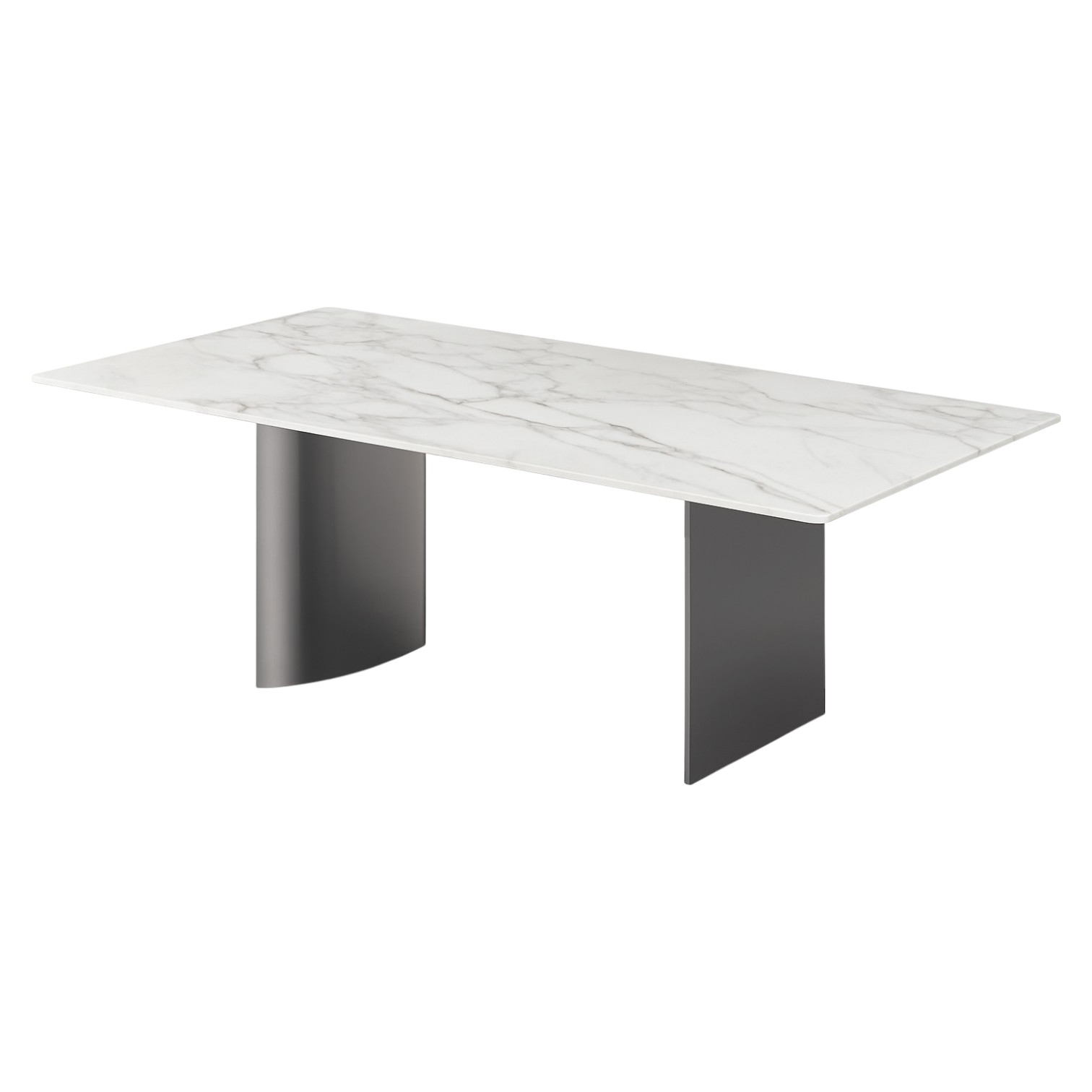 MESA DE COMEDOR RECTANGULAR. CON BASE EN ACERO INOXIDABLE Y TAPA DE CERÁMICA CALACATA