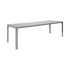 MESA DE COMEDOR MODELO JOKER. EXTENSIBLE. ESTRUCTURA EN ALUMINIO ANODIZADO NATURAL Y TAPA EN COLOR LINO BLANCO. BORDE EN ALUMINIO NATURAL. EQUIPADO CON DOS EXTENSIONES QUE TAMBIÉN SE PUEDEN UTILIZAR INDIVIDUALMENTE. LARGO TOTAL CON DOS EXTENSIONES 2.50 MTS.