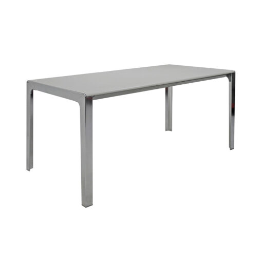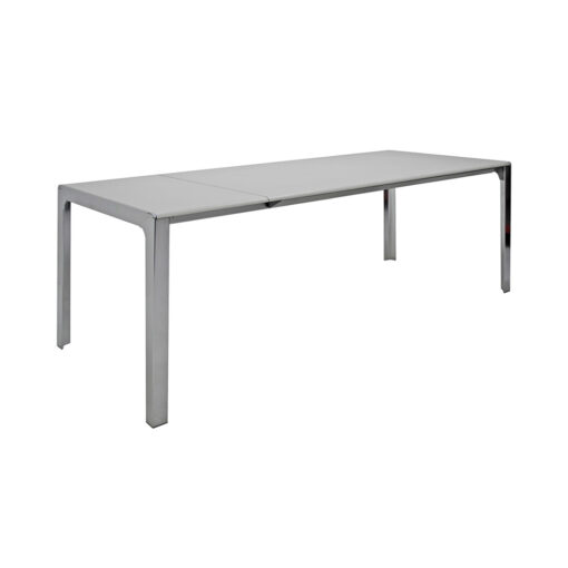 MESA DE COMEDOR MODELO JOKER. EXTENSIBLE. ESTRUCTURA EN ALUMINIO ANODIZADO NATURAL Y TAPA EN COLOR LINO BLANCO. BORDE EN ALUMINIO NATURAL. EQUIPADO CON DOS EXTENSIONES QUE TAMBIÉN SE PUEDEN UTILIZAR INDIVIDUALMENTE. LARGO TOTAL CON DOS EXTENSIONES 2.50 MTS.