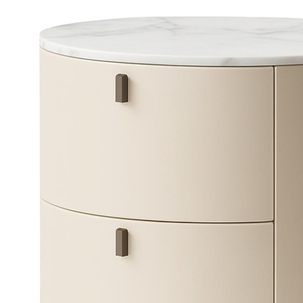 MESA DE LUZ MODELO ZIN. ESTRUCTURA EN MADERA COLOR VISON CON DOS CAJONES Y TAPA EN MARMOL CARRARA
