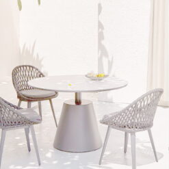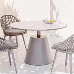 MESA DE COMEDOR MODELO CONE. REDONDA. BASE CONICA EN ALUMINIO Y TAPA EN CERAMICA CALACATA GOLD. ES UNA PIEZA IMPRESIONANTE QUE COMBINA DISEÑO MODERNO Y ELEGANCIA ATEMPORAL. SU BASE CÓNICA FABRICADA EN ALUMINIO PROPORCIONA ESTABILIDAD Y ESTILO CONTEMPORÁNEO MIENTRAS QUE LA TAPA DE CERÁMICA CALACATA GOLD AÑADE UN TOQUE DE LUJO Y SOFISTICACIÓN. LA CERÁMICA CALACATA GOLD CON SU EXQUISITO PATRÓN DE VETAS DORADAS SOBRE UN FONDO BLANCO AGREGA UN AIRE DE DISTINCIÓN A CUALQUIER ESPACIO. ESTA MESA ES PERFECTA PARA CREAR UN AMBIENTE REFINADO COMBINA BELLEZA Y FUNCIONALIDAD DE MANERA EXCEPCIONAL.
