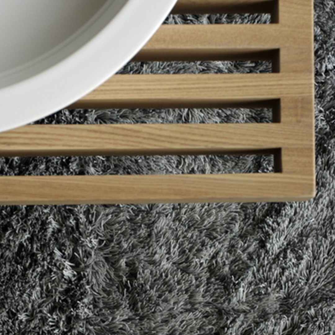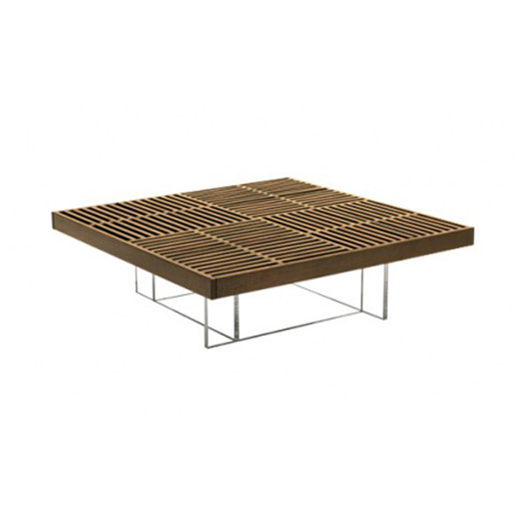 MESA DE LIVING MODELO RACK. CUADRADA. CON TAPA EN MADERA MACIZA EL LISTONES MARRONES OSCUROS Y BASE EN ACRILICO