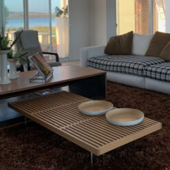 MESA DE LIVING MODELO RACK. RECTANGULAR. CON TAPA EN MADERA MACIZA EN LISTONES COLOR NATURAL Y BASE EN ACRILICO