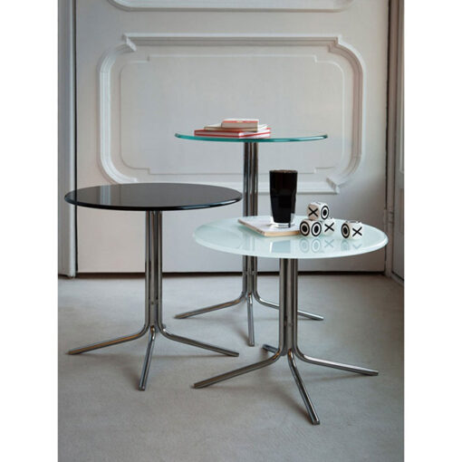 MESA LATERAL MODELO GENIUS. BASE DE ACERO Y TAPA EN VIDRIO COLOR ALUMINIO. DISEÑADA POR GIANLUIGI LANDONI