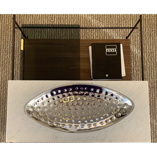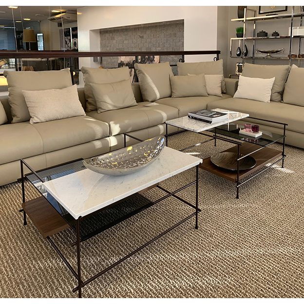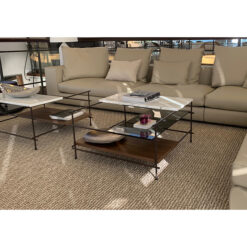 MESA DE LIVING CUADRADA MODELO MIKADO. CON ESTANTE EN VIDRIO COLOR HUMO Y TAPA DE MARMOL BLANCO Y MADERA.