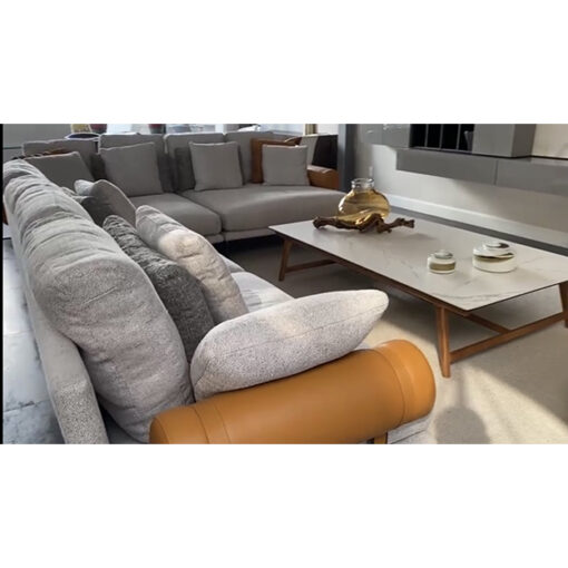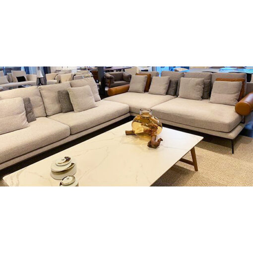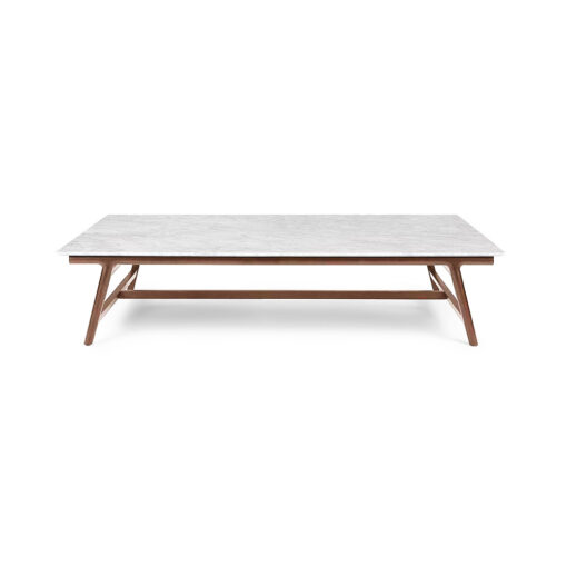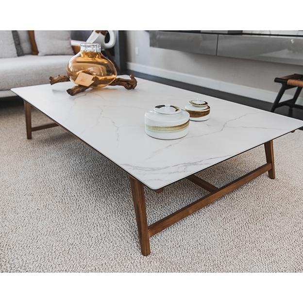 MESA DE LIVING MODELO KYRIAT. RECTANGULAR. CON TAPA DE CERÁMICA IMITACIÓN CARRARA BLANCO Y ESTRUCTURA EN MADERA COLOR TOSTADO