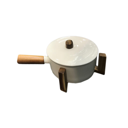 OLLA DE CERAMICA CON ASA DE MADERA SOBRE SOPORTE DE MADERA