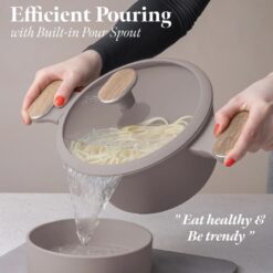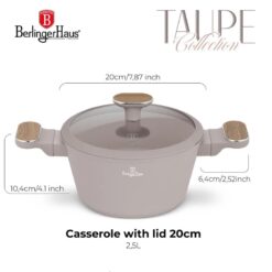 OLLA CON TAPA DIAM. 20CM 2.6L COLECCIÓN TAUPE. FABRICADA EN ALUMINIO FORJADO DE PRIMERA CALIDAD. EL REVESTIMIENTO ANTIADHERENTE DE 3 CAPAS TITANPRO PERMITE COCINAR CON UNA CANTIDAD MÍNIMA DE ACEITE LO QUE PROMUEVE COMIDAS MÁS SALUDABLES Y FACILITA LA LIMPIEZA. LAS ASAS ERGONÓMICAS Y SUAVES AL TACTO QUE SE MANTIENEN FRÍAS ESTÁN DISEÑADAS PARA BRINDAR COMODIDAD Y SEGURIDAD PERMITIÉNDOLE MANIPULAR LAS SARTENES CON CONFIANZA INCLUSO CUANDO ESTÁN CALIENTES. ESTA SARTEN ES COMPATIBLE CON TODO TIPO DE PLACAS DE COCINA: GAS ELÉCTRICAS VITROCERÁMICAS E INDUCCIÓN