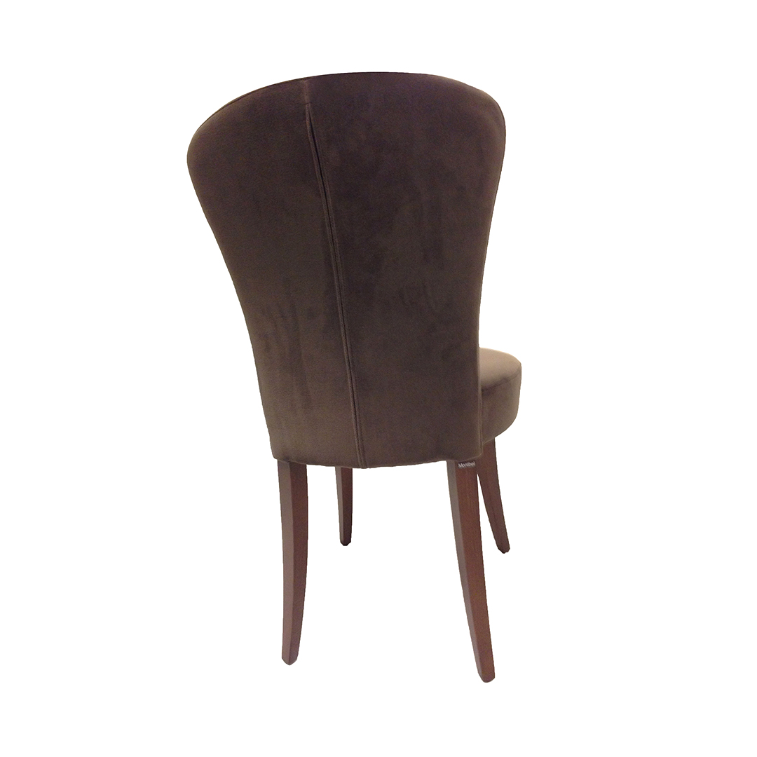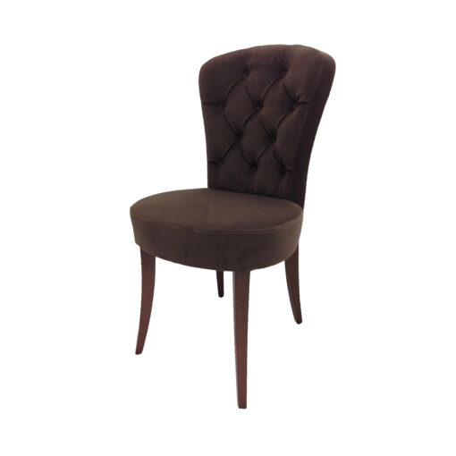 SILLA DE COMEDOR MODELO EUFORIA. ESTRUCTURA DE MADERA MACIZA. ASIENTO Y RESPALDO TOTALMENTE TAPIZADOS EN GAMUZA COLOR MARRON LUNA. PARTE DELANTERA DE LA ESPALDA CON TAPIZADO CAPITONNÉ (ABOTONADO). EXTERIOR DE LA ESPALDA SIN DETALLE DE BOTÓN PERO CON DETALLE DE CREMALLERA.