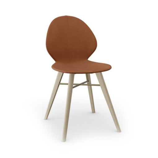 SILLA DE COMEDOR MODELO BASIL. PATAS DE MADERA COLOR AVELLANA P328 Y ASIENTO EN CUERO COLOR COGNAC R04. ALTURA DEL ASIENTO 47 CM. LA COMBINACIÓN DE MATERIALES HA PERMITIDO REALIZAR UNA SILLA RESISTENTE LIGERA Y ERGONÓMICA DE DISEÑO MODERNO. LA FORMA DEL ASIENTO QUE RECUERDA LA MORFOLOGÍA DE UNA HOJA DE ALBAHACA DEBIDO AL NERVADO CENTRAL SE CONVIERTE AL MISMO TIEMPO EN EL TEMA ESTRUCTURAL Y DECORATIVO DE ESTE PRODUCTO.