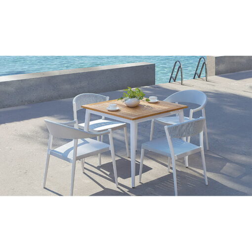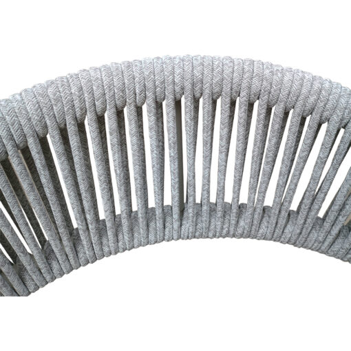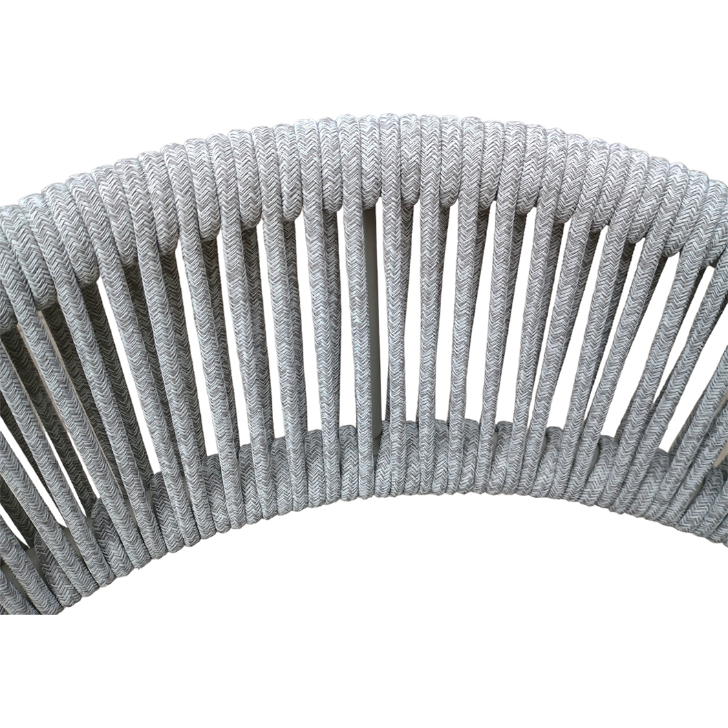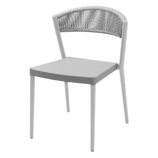 SILLA DE COMEDOR MODELO PRAGE. ESTRUCTURA EN ALUMINIO CREAM GREY 1215966 TIRAS EN CUERDA LIGHT GREY 44219 EN EL RESPALDO COLOR BEIGE ASIENTO EN TELA SLING LIGHT GREY 50567 LA SOLIDEZ LA LIGEREZA LA VERSATILIDAD Y EL HECHO DE SER APILABLE RESPONDE A TODAS LAS EXIGENCIAS DE CONFORT. EL USO DE UNA TRAMA DE CUERDA DENSA PARA EL RESPALDO ASEGURA LA COMODIDAD NECESARIA Y LA MÁXIMA RESISTENCIA A LOS AGENTES ATMOSFÉRICOS.