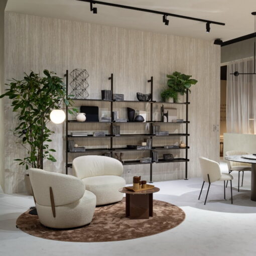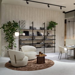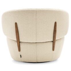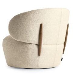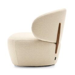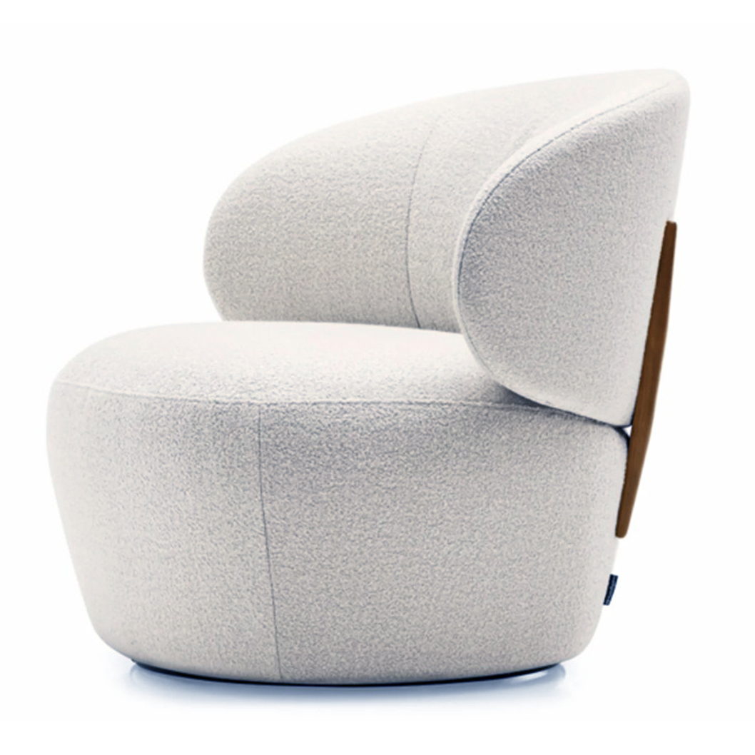 SILLON DE LIVING MODELO MARA. GIRATORIO. TAPIZADO EN TELA BUCLE BLANCA CON DETALLES EN MADERA EN EL RESPALDO.EL SILLÓN MARA ES UNA OBRA MAESTRA DE CONFORT Y DISEÑO. ACOLCHADO ENRIQUECIDO CON DOS INSERTOS DE MADERA NOGAL CANALETTO. EL DISEÑO ORGÁNICO INSPIRADO EN LA NATURALEZA Y EN MATERIALES EVOCADORES JUNTO CON EL MECANISMO GIRATORIO TRANSFORMAN A MARA EN UN REFUGIO ACOGEDOR QUE PROMUEVE UNA EXPERIENCIA DE RELAJACIÓN INIGUALABLE. MARA ES LA EXPRESIÓN PERFECTA DEL CONCEPTO COCOONING OFRECIENDO UN ABRAZO VISUAL Y TANGIBLE DE COMODIDAD Y RELAJACIÓN.