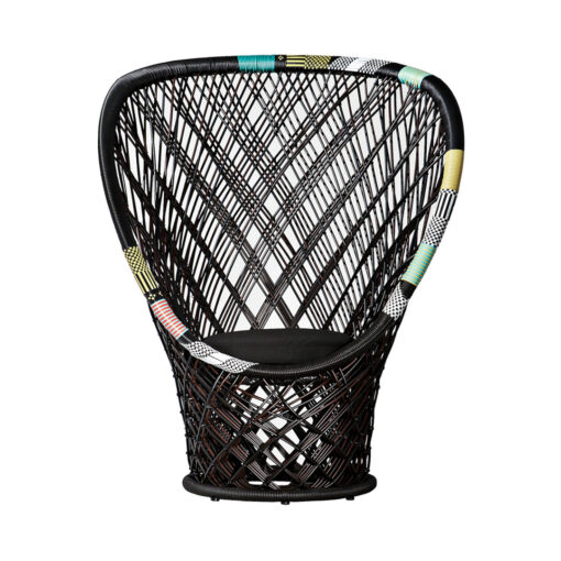 SILLON DE LIVING MODELO PAVO REAL. CON ESTRUCTURA EN ALUMINIO Y TEJIDO EN PLASTICO NEGRO SIRVE PARA EL EXTERIOR DISEÑADO POR PATRICIA URQUIOLA. ANTE LA FASCINACIÓN POR ESOS GRANDES SILLONES DE MIMBRE Y CAÑA TAN DIFUNDIDOS EN EL SUDESTE ASIÁTICO PATRICIA URQUIOLA REALIZA UNA SOFISTICADA OPERACIÓN DE REVISIÓN. LOS VOLÚMENES SE EXPANDEN LAS TRENZAS SE DUPLICAN LOS PATRONES APARECEN INESPERADAMENTE Y ELEGANTEMENTE FRAGMENTADOS CON LA SEDUCTORA TACTILIDAD DE LOS MATERIALES NATURALES.