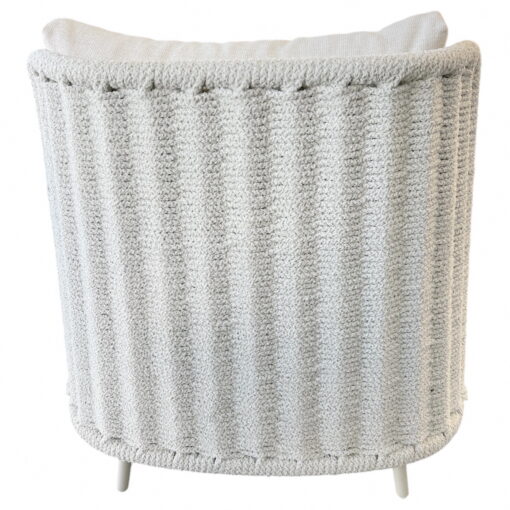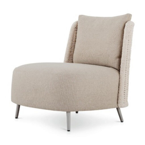 SILLON DE COMEDOR MODELO LISBOA. ESTRUCTURA EN ALUMINIO CON PINTURA ELECTROSTATICA COLOR ARENA RESPALDO TRENZADO EN CUERDA BOUCLE COLOR OPALA Y ASIENTO DE ESPUMA Y FUNDA TAPIZADO EN TELA PEROLA UNIQUE