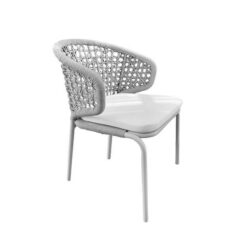 SILLON DE COMEDOR MODELO PACIFIC. ESTRUCTURA EN ALUMINIO OLIVE GREY 1215966 Y TIRAS EN CUERDA KHAKI HF-003 EN EL RESPALDO. ASIENTO EN TELA SUNBRELLA SEF4008-1. LA ESTRUCTURA DE LA SILLA ESTÁ HECHA DE PERFILES DE ALUMINIO CON RECUBRIMIENTO EN POLVO QUE SE DOBLAN EN UNA LÍNEA CONTINUA. LAS ESQUINAS SON RECTAS PERO LOS TUBOS MANTIENEN UNA FORMA REDONDA LO QUE REQUIERE UN GRAN DOMINIO. EL RESPALDO ESTÁ UNIDO AL MARCO EN SOLO 2 PUNTOS Y PARECE FLOTAR SIN SUSPENSIÓN SOBRE EL ASIENTO. EL TEJIDO ABIERTO HACE REFERENCIA A LA ANTIGUA TRADICIÓN DEL TEJIDO Y DA UN SOPORTE FLEXIBLE A LA ESPALDA
