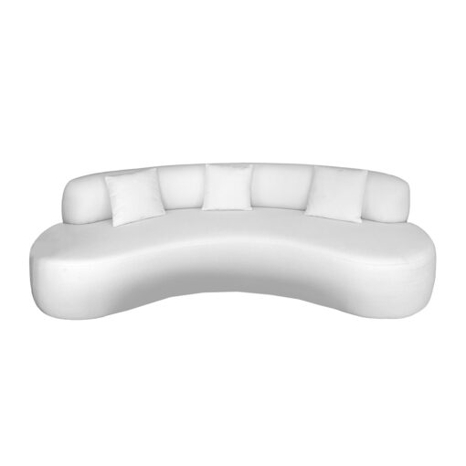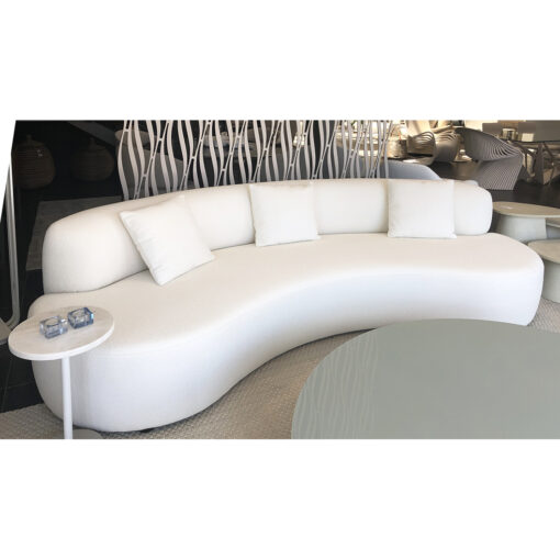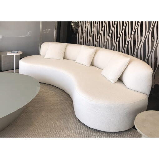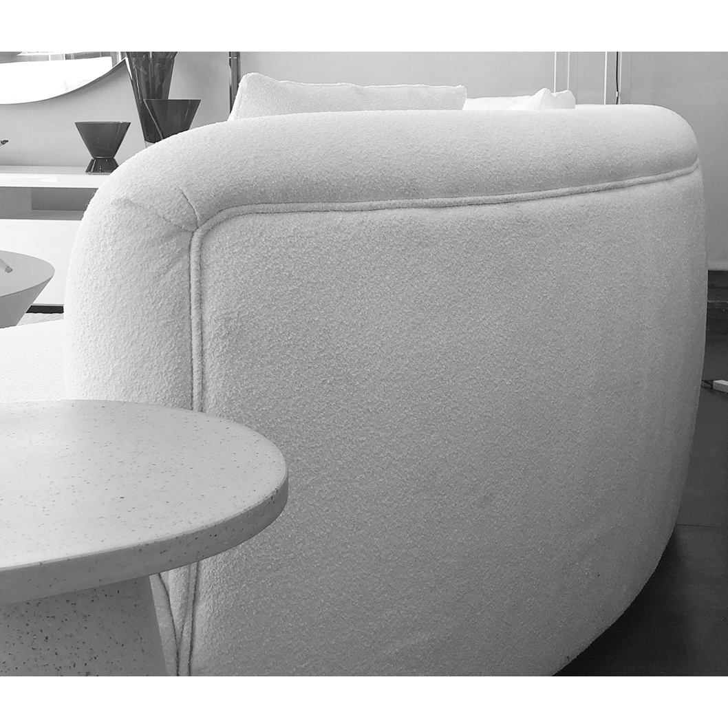 SOFA CON FORMA ESTRUCTURA EN MADERA TAPIZADO EN TELA BLANCA BUCLE CLÁSICO PERO CONTEMPORÁNEO CON SU APARENTE SENCILLEZ FORMAL SU CARACTERÍSTICA PRINCIPAL QUE ES LA COMODIDAD SURGE DE LAS RELACIONES ENTRE LA PROFUNDIDAD DEL RESPALDO Y DEL ASIENTO MIENTRAS QUE SU INCONFUNDIBLE RASGO DISTINTIVO RESIDE EN SUS FINAS PATAS DE ACERO UN PEQUEÑO DETALLE QUE DOTA A UN PRODUCTO BASTANTE TRADICIONAL DE UN GENUINO TOQUE DE MODERNIDAD Y LIGEREZA CONVIRTIÉNDOLO EN UN SOFÁ VERDADERAMENTE ATEMPORAL