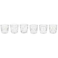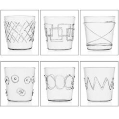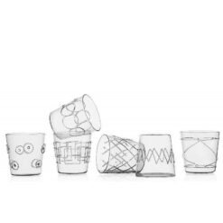 SET DE 6 VASOS MODELO LOLLIPOP. DE VIDRIO BOROSILICATO CON APLICACIONES DE PASTA SOPLADOS A MANO. FORMA LIMPIA Y MODERNA. LOS CARTELES GRÁFICOS EN VIDRIO CARACTERIZAN DE FORMA DIFERENTE CADA VASO QUE COMPONE EL CONJUNTO. CAPACIDAD 390 ML