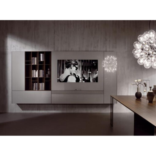 UNIDAD DE PARED MODELO N.C. SMART WALL. EN LACA GRIS Y MADERA WENGE CON SISTEMA DE AUDIO INCLUIDO Y SOPORTE PARA TELEVISOR. PUERTAS LACADAS MATE BRILLANTE. MUEBLE TV CON FRONTAL DE CRISTAL EXTRACLARO LACADO POSTERIOR. ESTANTERÍAS Y LADOS FINALES EN LACADO MATE. LA COMBINACIÓN DE ELEMENTOS DE LA MISMA PROFUNDIDAD YA SEAN CERRADOS O ABIERTOS EN DIRECCIÓN VERTICAL CREA DIFERENTES NIVELES DE COMPOSICIÓN. LOS ELEMENTOS TAMBIÉN SE PUEDEN COMBINAR EN UNA DIRECCIÓN HORIZONTAL LO QUE SIGNIFICA QUE NO SE PONEN LÍMITES AL TAMAÑO NI A SU CREATIVIDAD.